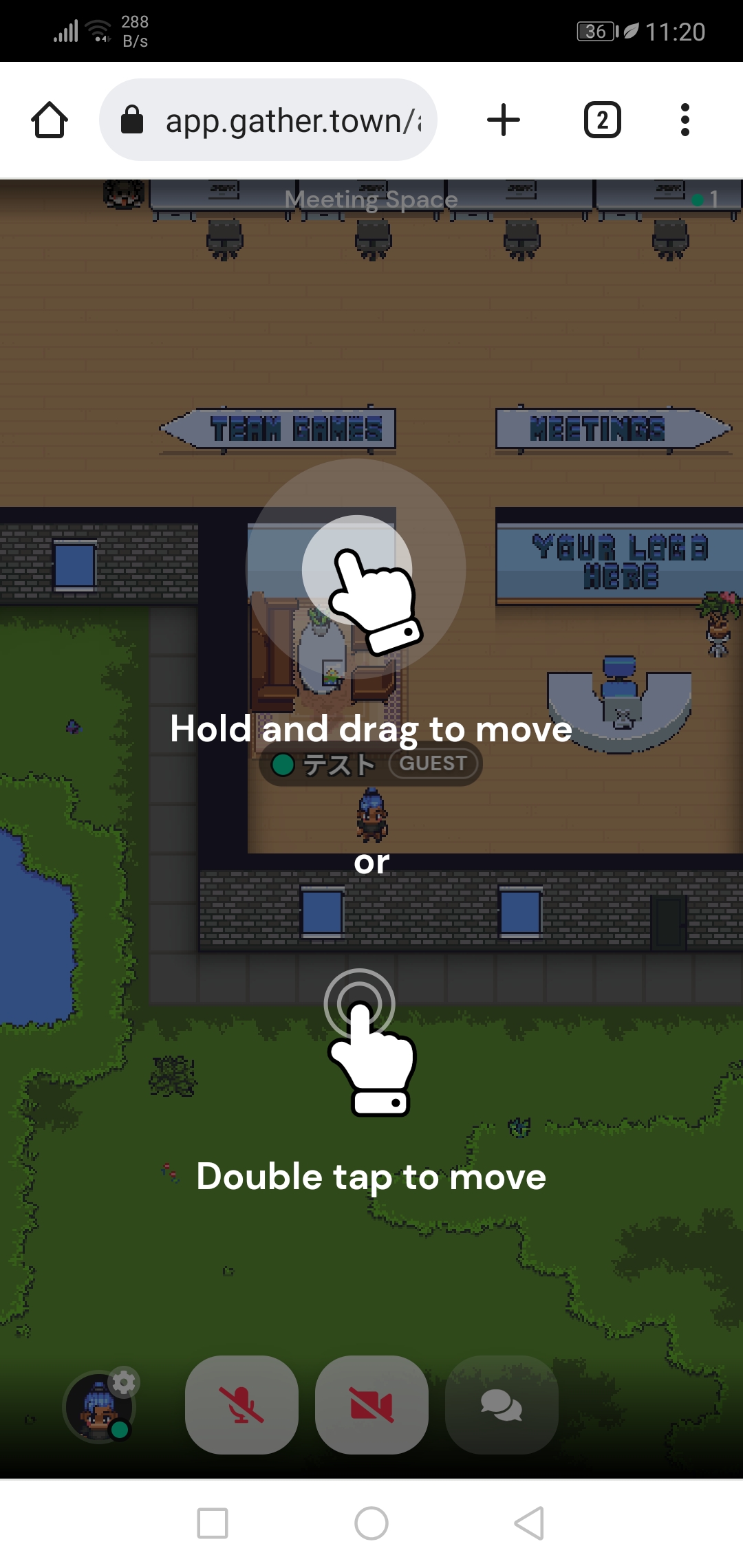入室すると自身のアバターの動かし方の説明が出ます。(画面をタッチしたまま動かすとその方向に動く、画面で行きたいとこを二回たたくとそこにジャンプする)一度タップすれば消えます。