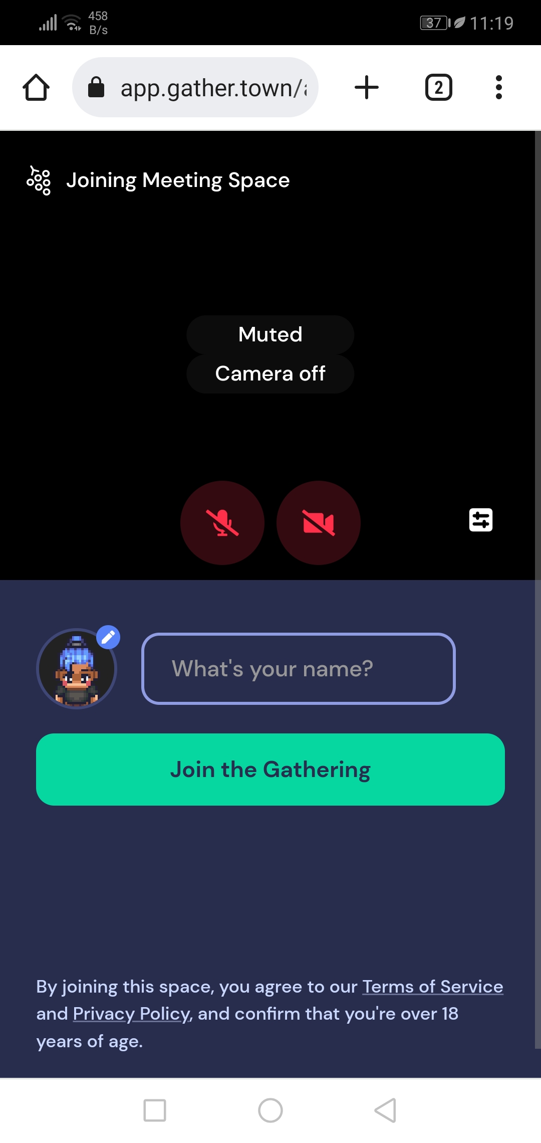画面真ん中のカメラマークをクリックして”カメラoff”(アイコンが赤くなります)にしておいてから、ニックネームを記入して”Join the Gathering”ボタンをクリックします。