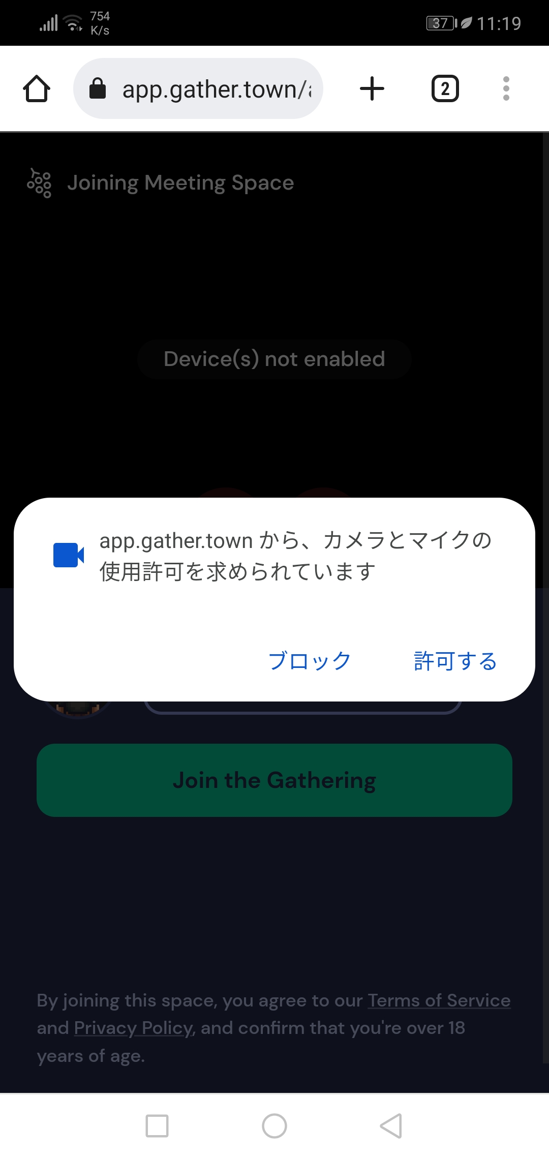 すると、スマホ/PCが、app.gather.townにマイクとカメラのアクセス権を与えていいか聞いてくるので、「許可する」をクリック。