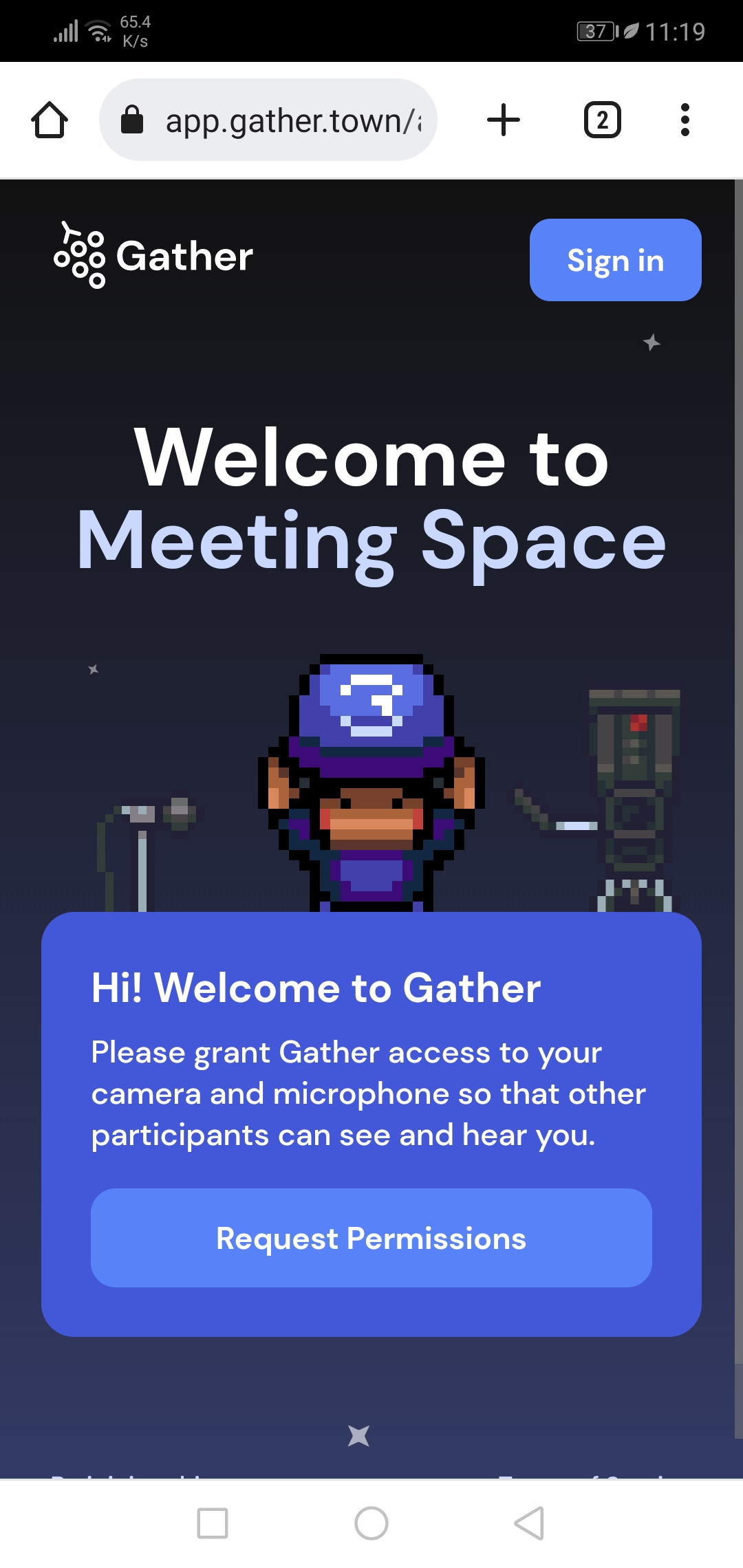Gather Townに入ると、以下のようにカメラとマイクのアクセス許可要求が表示されます。”Request Permmissions(アクセス権要求)”をクリックしてスマホ/PCにアクセス権を要求します。